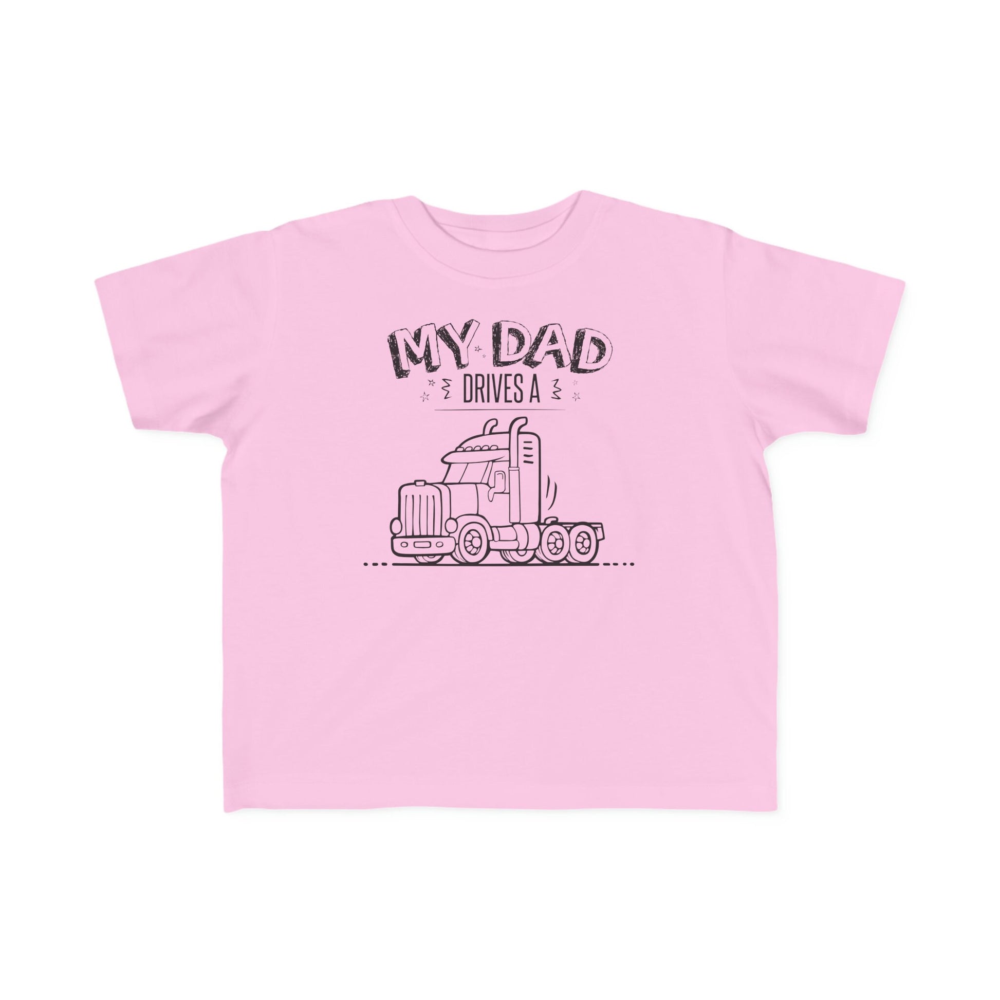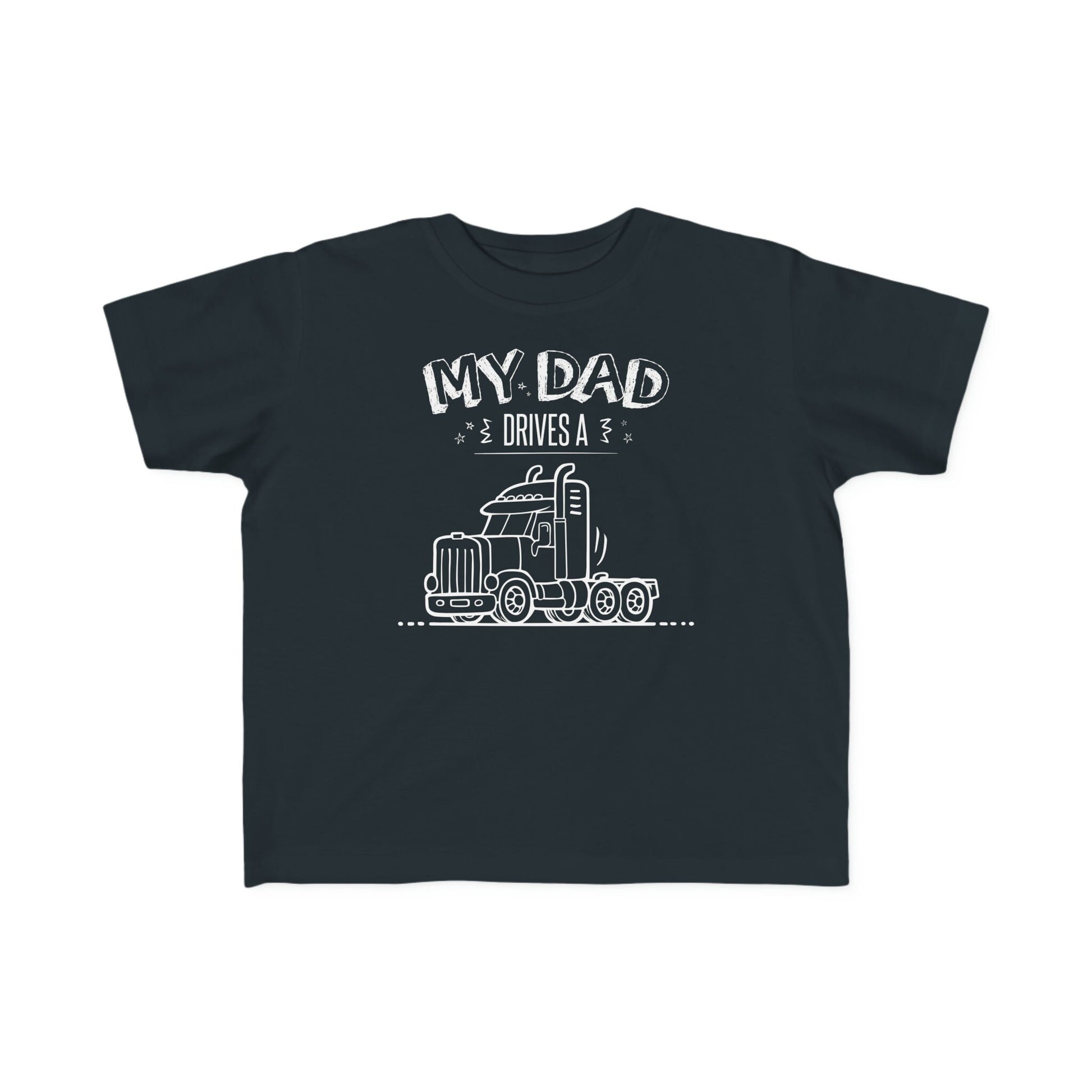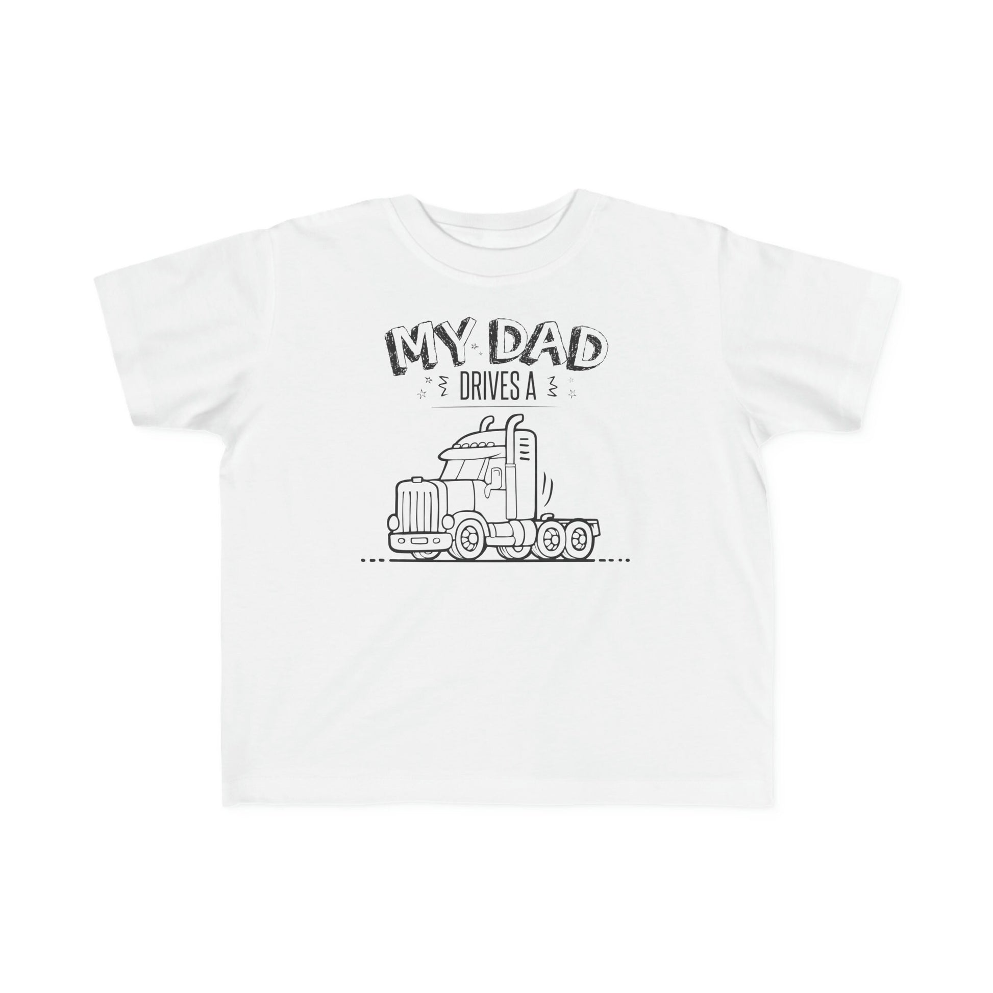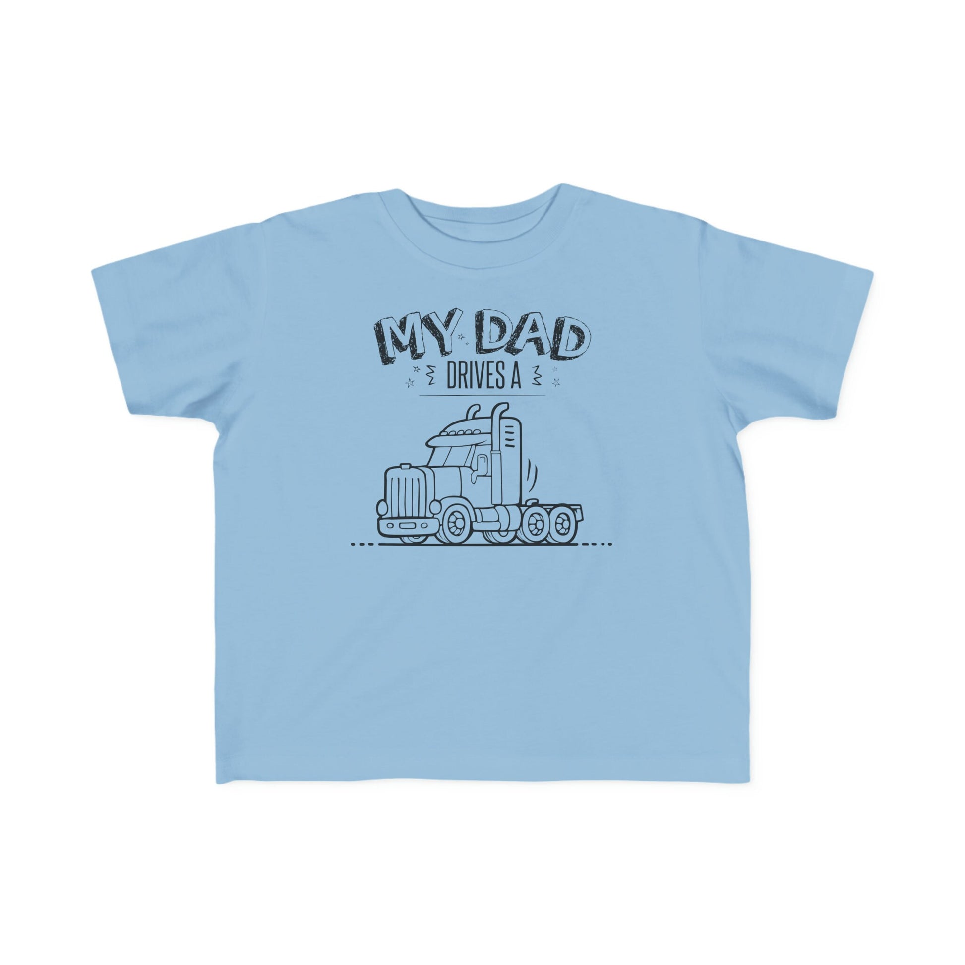 An original design outline of a semi-truck next to the text My Dad Drives a Semi Truck! Cute toddler gift for a Trucker, His Birthday, Christmas, Anniversary, Truck owners, Truck lovers, Kid's Birthday and just because it's a awesome way to let others know what you drive. Rabbit Skins 3322